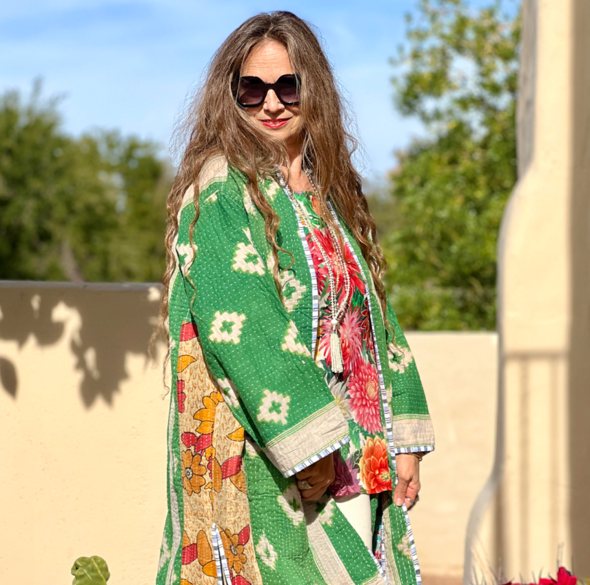 "Beautiful Kantha Coat! Stunning handwork patch coat worthy of an evening in a Bohemian restaurant or lounging with an air of chic. Beautiful colors and worthy of all the fuss it will receive!" - Jodi, October 2024