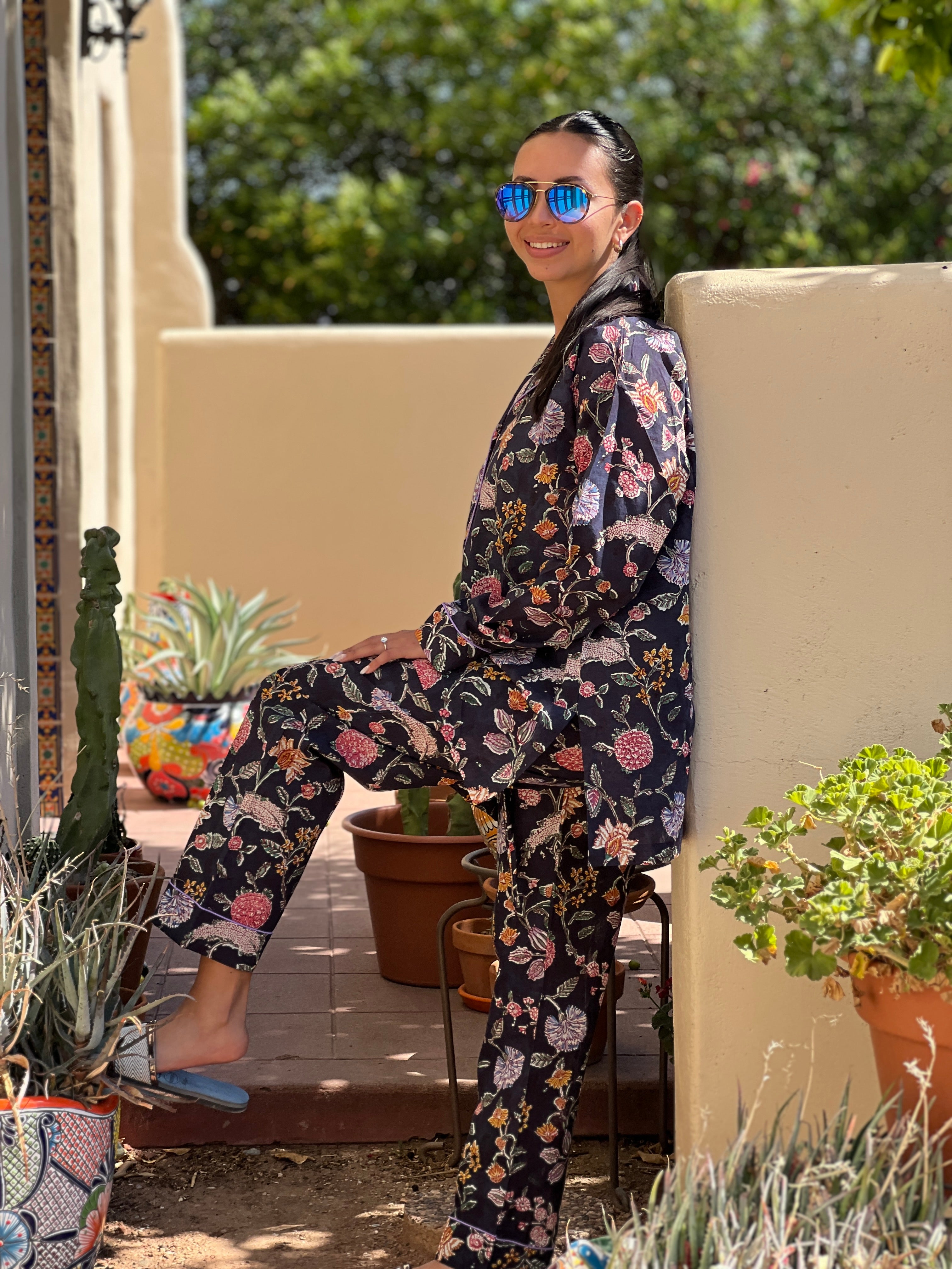 Jean Marie had to search far and wide to find a block printer who would make this fabric for Pax Philomena! The Black Beauty pajamas are made with a very unique block printed cotton voile fabric that is composed of nine different colours. This type of block print is as hard to find as it is to make, so it took us a few years to get these pajamas going. However we love the idea of a black floral print to sleep in.
